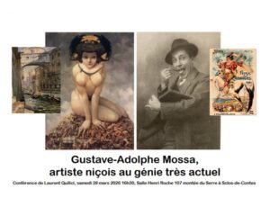 G.-A. Mossa peintre niçois au génie encore méconnu Conférence de Laurent Quilici le 28 mars 2026 à Contes Connaissez-vous la « Joconde niçoise»? Et Gustave-Adolphe Mossa? On découvre de plus en plus ce peintre surdoué au talent universel et aux trésors insoupçonnés. Laurent Quilici, guide-conférencier, vous le présente lors d’une conférence d’une heure et demie