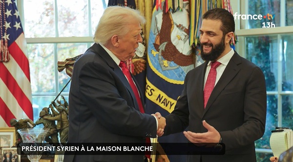 Photo du haut : La poignée de mains Trump-Al Charaa à la Maison Blanche le 11 novembre 2025 (Capture d’écran du journal télévisé de France 2)
